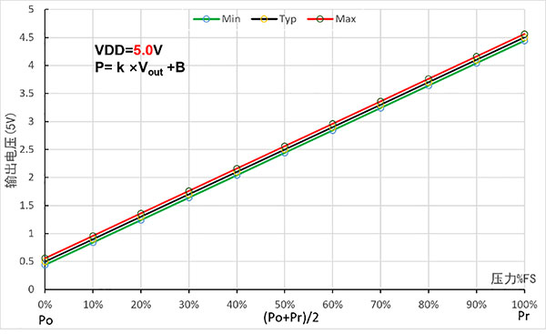 Merk: Vout er den analoge utgangsspenningen (enhet: V); P er trykkverdien (i kPa); k. B representerer den lineære koeffisienten og offset, som vist i tabellen nedenfor.